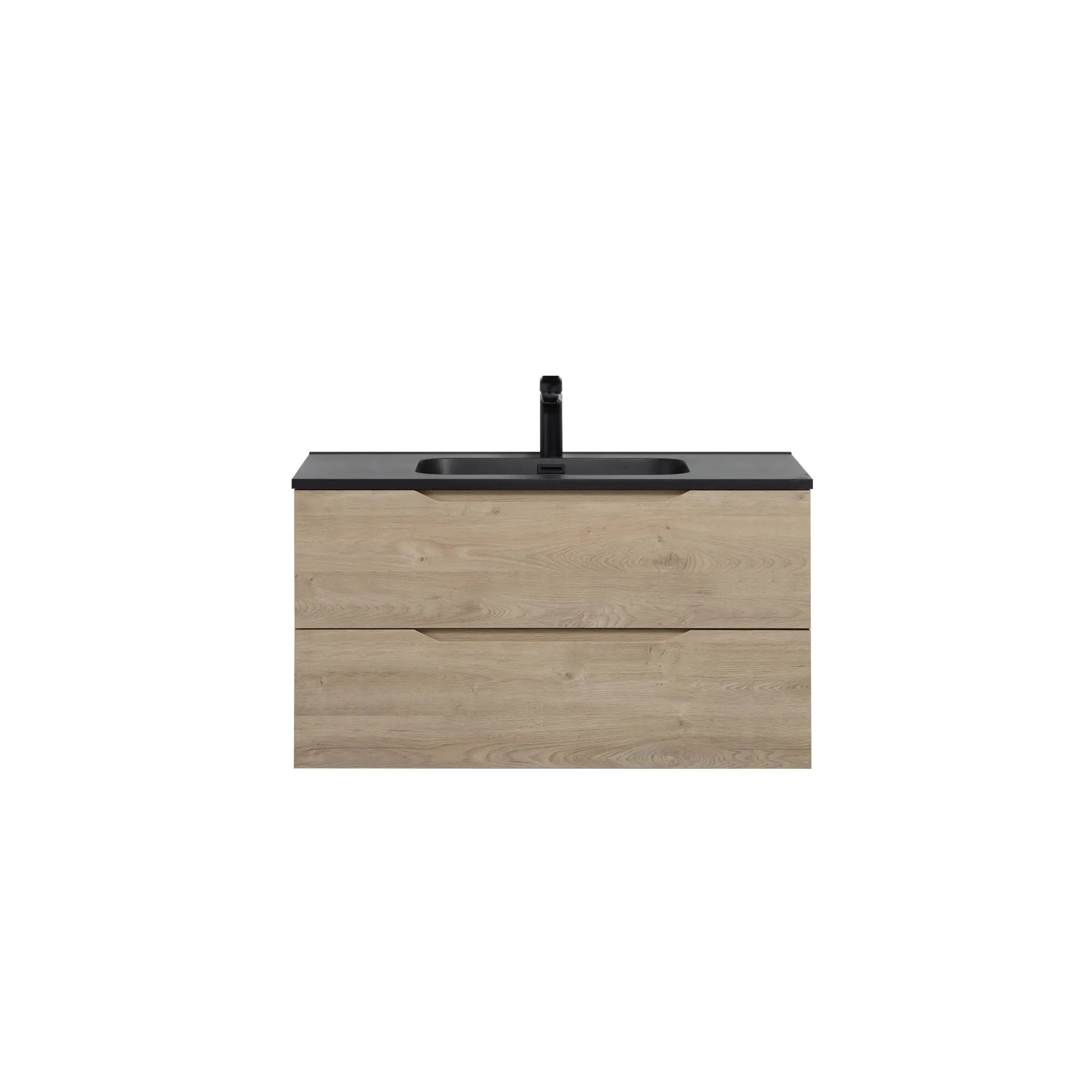 Featuring 2 sleek matte black basin with a curved design that enhances water flow and prevents splashes, this vanity is crafted from durable, waterproof, and moisture-resistant materials for long-lasting performance. The Evita Oak cabinet adds a natural, modern touch, complementing the black countertop for a sophisticated contrast. The drawers are designed with a recessed groove, allowing for easy access and a seamless, minimalist aesthetic.