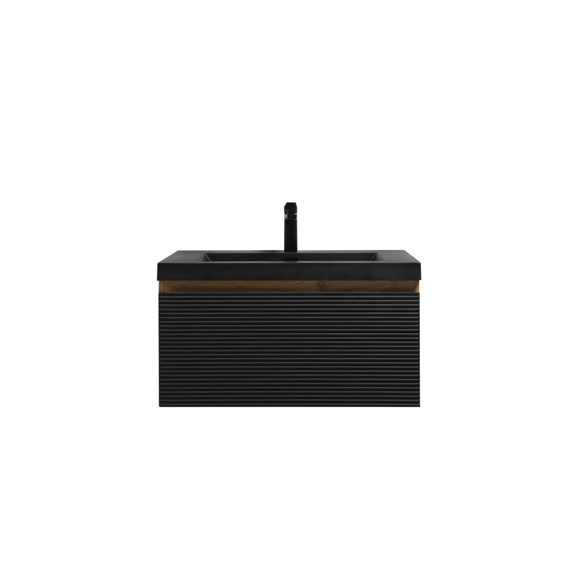 The TONA Crius features a high-end black quartz sands integrated sink with a patented drainage design. Made from eco-friendly materials, it offers ample storage with two soft-closing drawers, space-saving U-shaped drainage, and a sleek, contemporary look. The vanity’s stylish design combines functionality and efficiency, ensuring a clutter-free bathroom with high-quality, easy-to-maintain features.