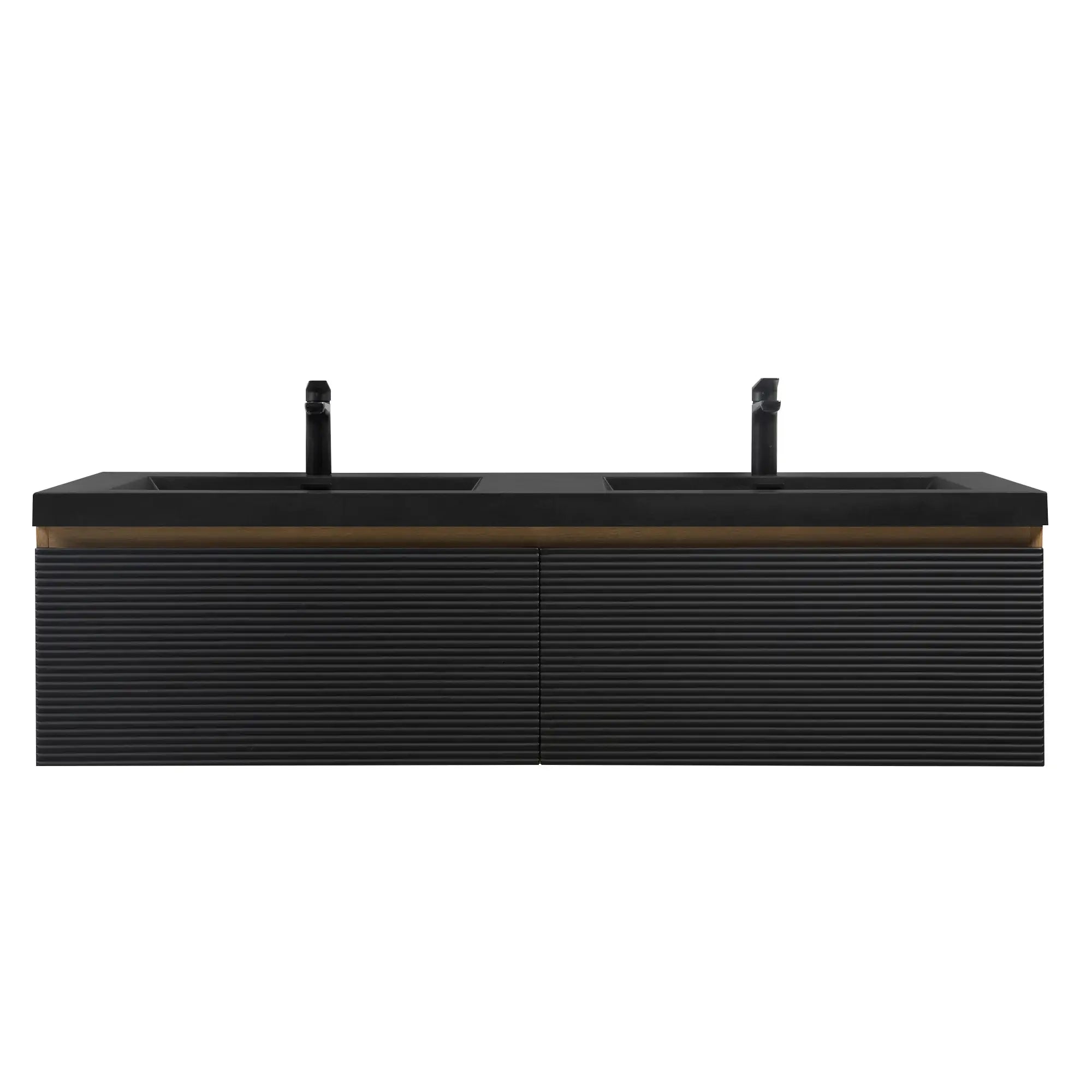 The TONA Crius features a high-end black quartz sands integrated sink with a patented drainage design. Made from eco-friendly materials, it offers ample storage with two soft-closing drawers, space-saving U-shaped drainage, and a sleek, contemporary look. The vanity’s stylish design combines functionality and efficiency, ensuring a clutter-free bathroom with high-quality, easy-to-maintain features.