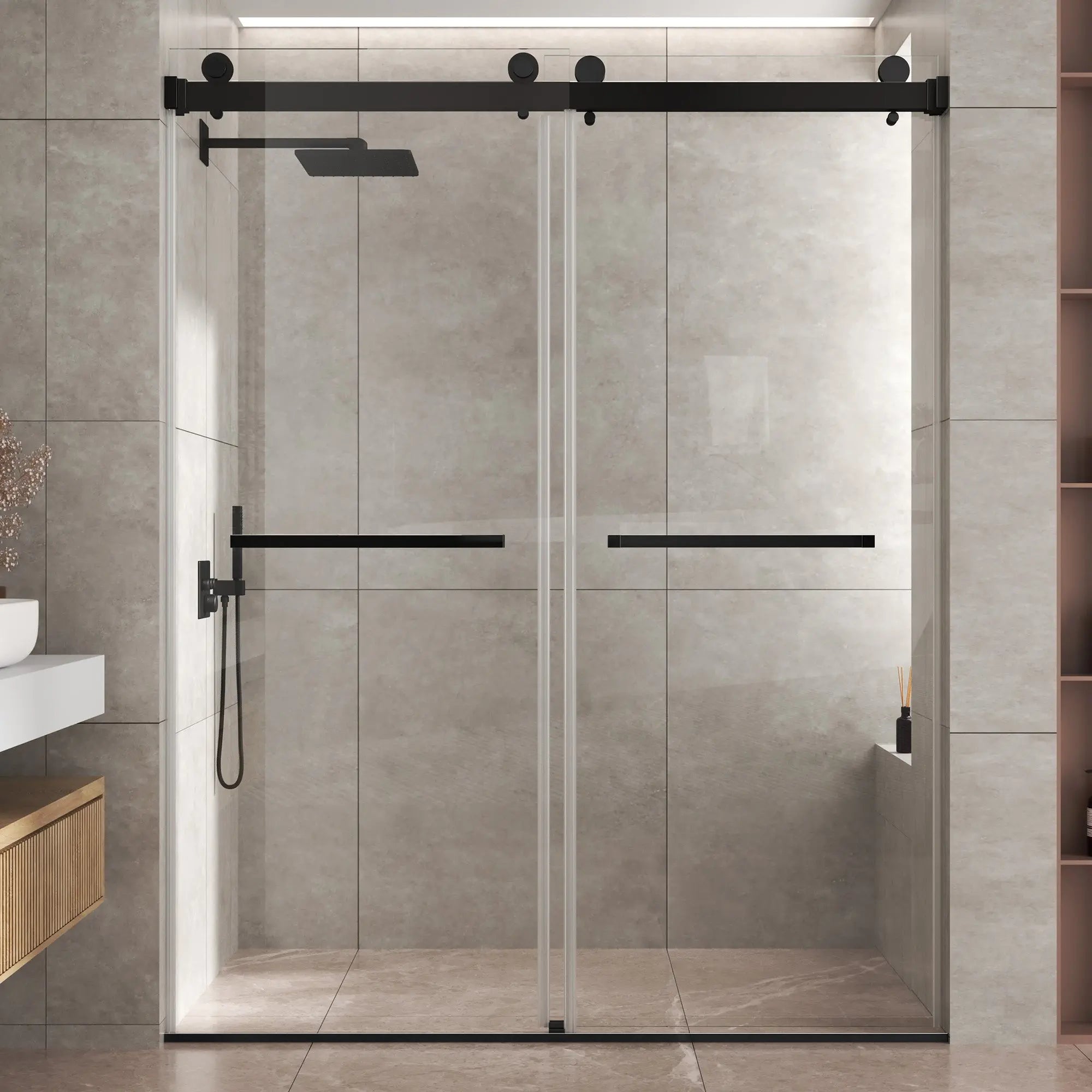 Transform your bathroom with this stylish, high-performance frameless shower door. Made from durable 304 stainless steel and featuring a sleek matte black finish, it includes 3/8"(10mm) tempered glass for safety and clarity. The double sliding design ensures smooth, effortless access and saves space, making it perfect for both small and large bathrooms, while silent rollers provide smooth, quiet operation. Reversible installation makes it easy to fit into any bathroom, combining high performance with modern style for a long-lasting, corrosion-resistant solution.