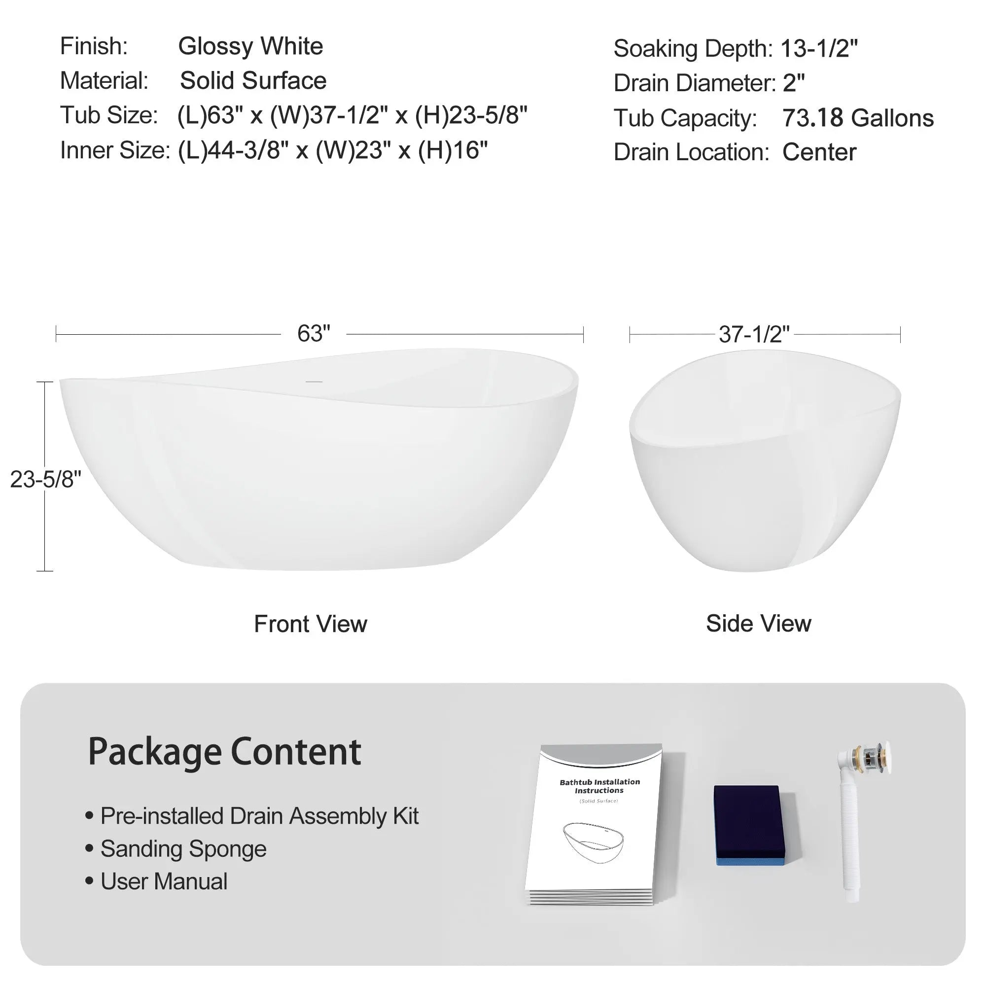• Cunard 63" Stone Resin Freestanding Soaking Bathtub – Glossy White TONA Bathroom Furniture