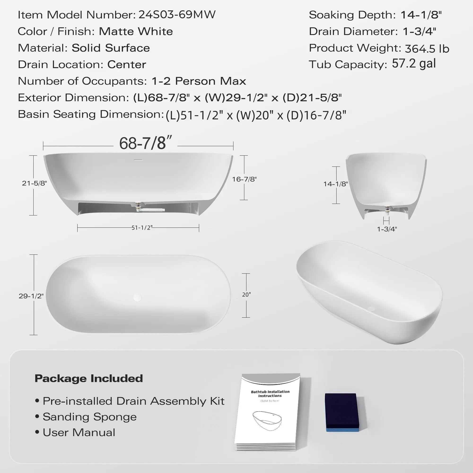 - Nevis 69'' Matte White Stone Resin Freestanding Soaking Bathtub