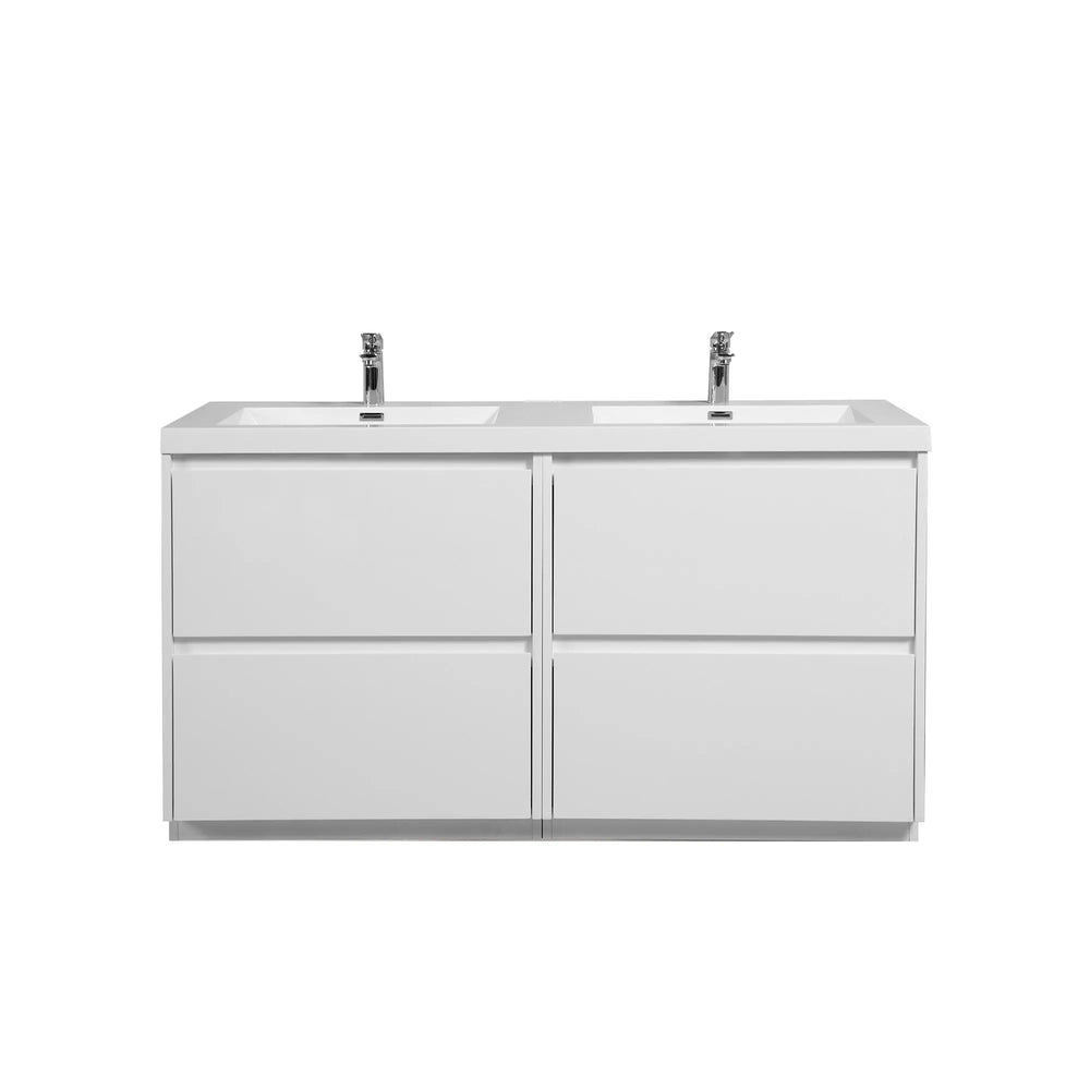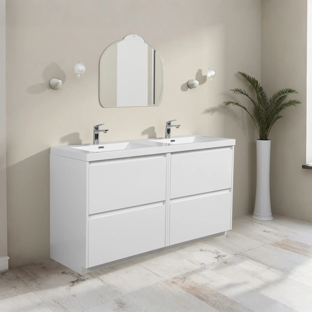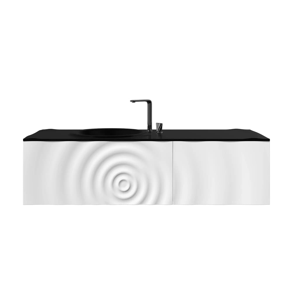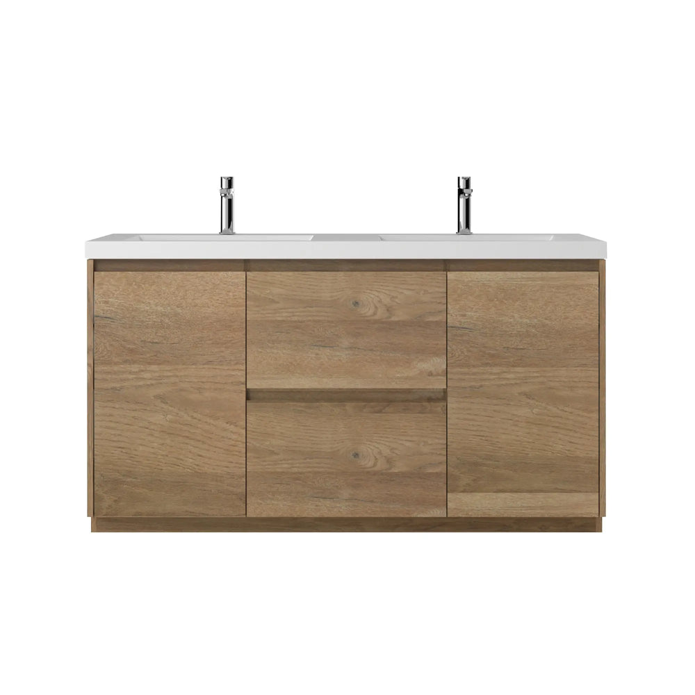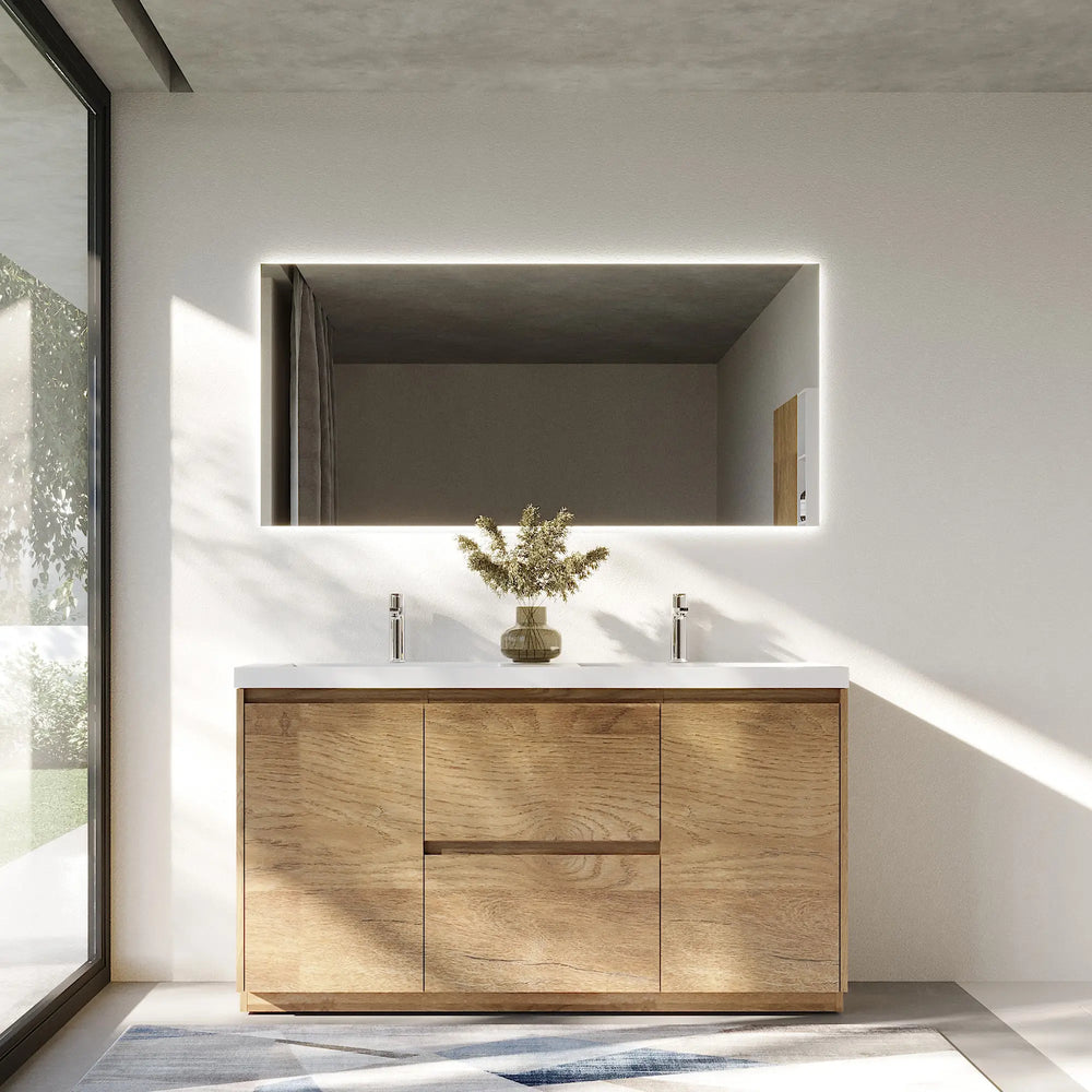 Compact yet practical, it features a double-door cabinet for concealed storage and an open shelf at the base for everyday essentials or décor. The white resin basin is durable, easy to maintain, and naturally resistant to stains and bacteria. With its soft-close system and 45° invisible handle, Allen blends convenience, safety, and elegance in a refined freestanding form.
