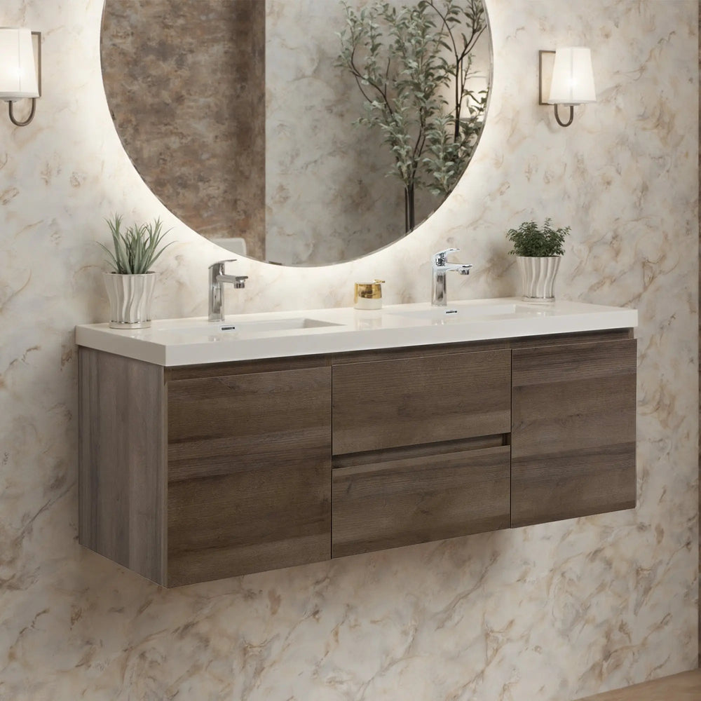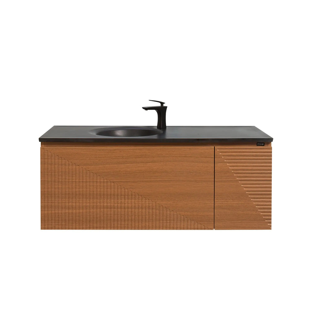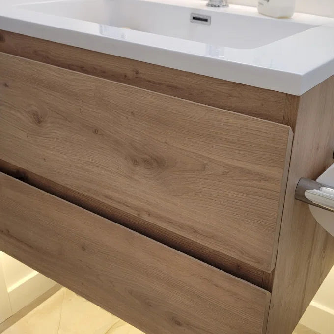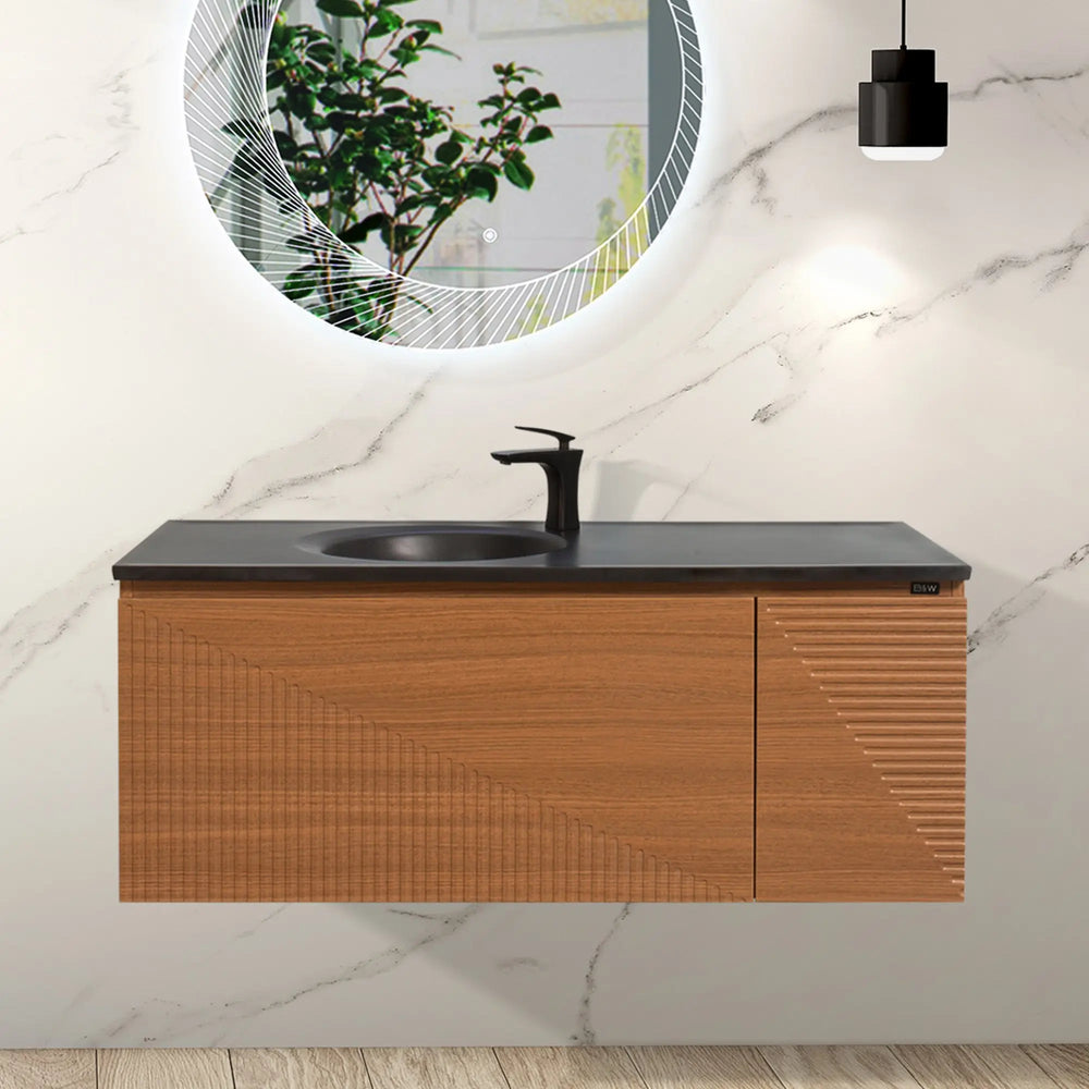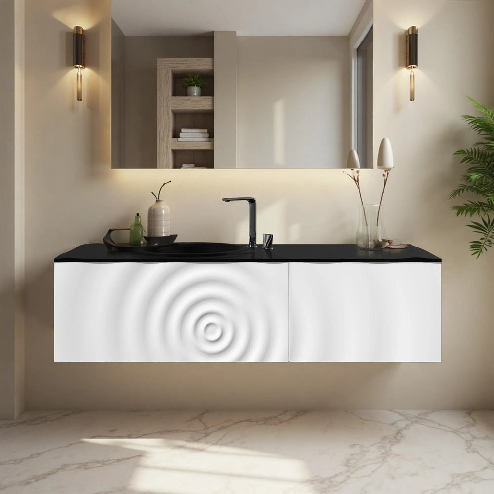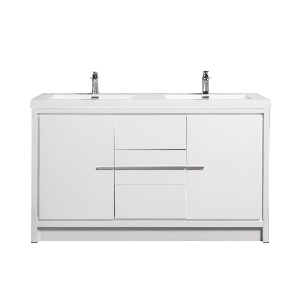 Compact yet practical, it features a double-door cabinet for concealed storage and an open shelf at the base for everyday essentials or décor. The white resin basin is durable, easy to maintain, and naturally resistant to stains and bacteria. With its soft-close system and 45° invisible handle, Allen blends convenience, safety, and elegance in a refined freestanding form.