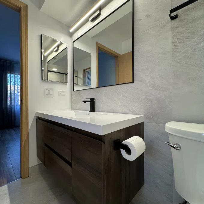• Open Shelf: Bottom shelf for towels, baskets, or decorative display.