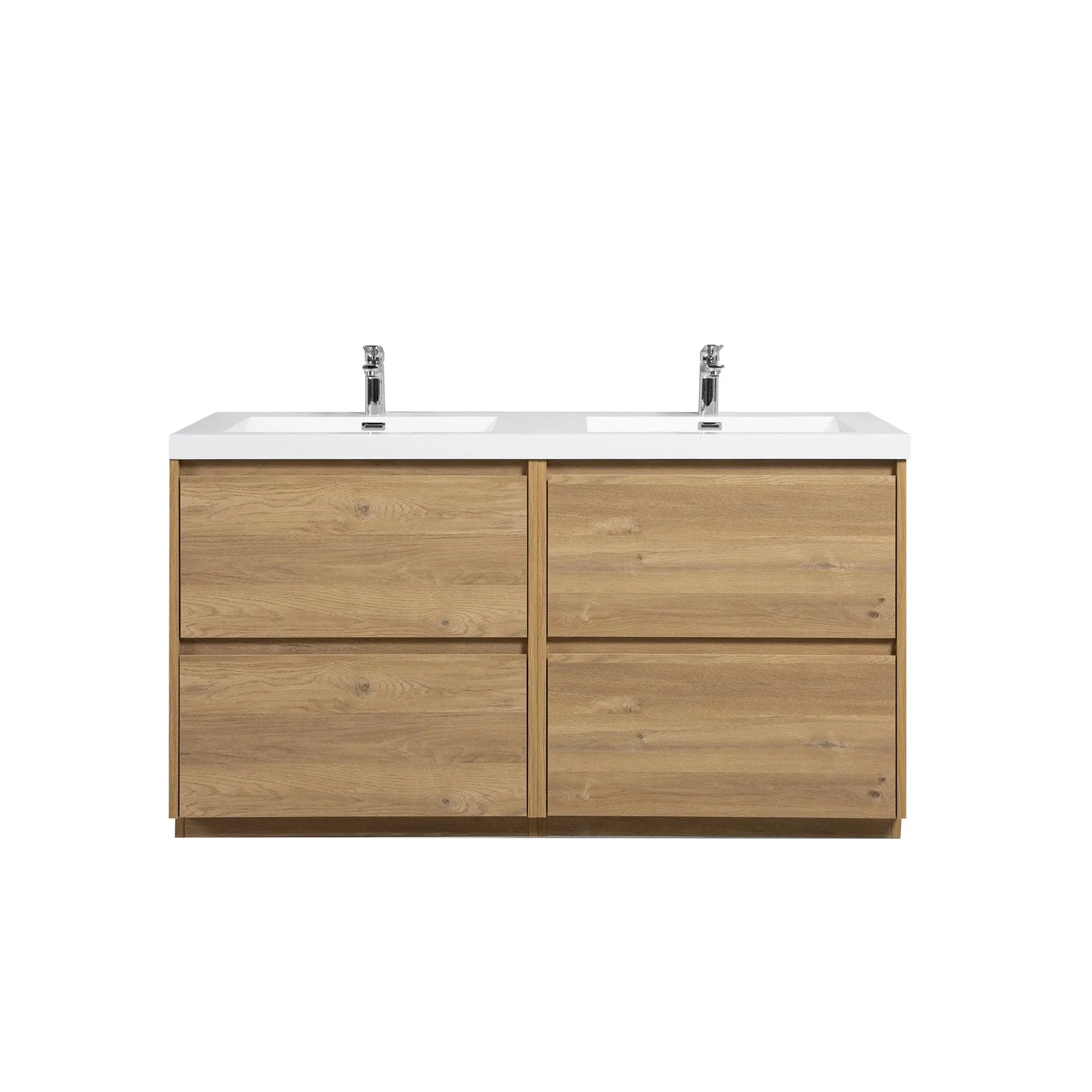 Combining two 30" cabinets into one elegant unit, this double sink vanity offers ample space and functionality for shared use. The White Resin Top pairs seamlessly with the warm Natural Oak finish, creating a modern, stylish look. Soft-closing drawers and a patented drainage system ensure practicality, while the integrated design maximizes storage space without compromising aesthetics.